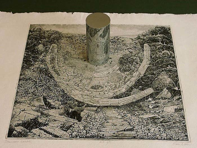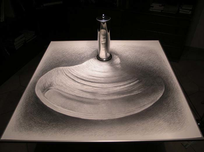 Of course Hurwitz isn’t the only artist creating pieces in this style. Another prominent anamorphic artist who creates art that can only be actually seen using a mirrored cylinder is, István Orosz. Here are few of his pieces.