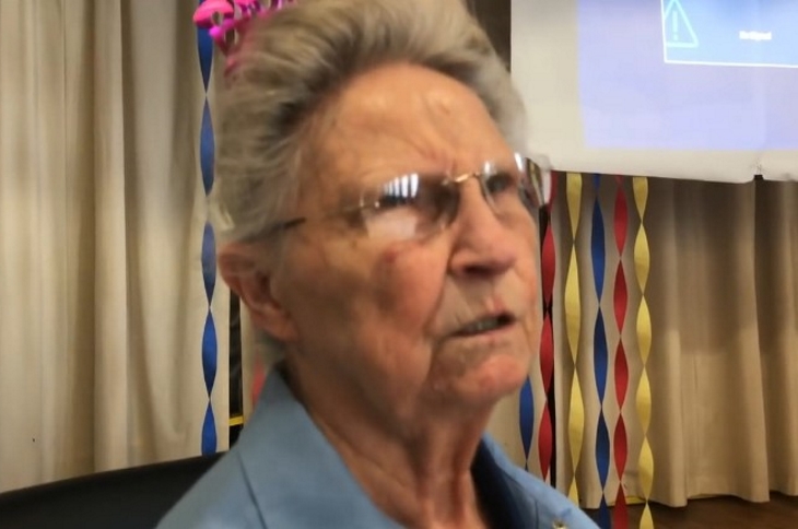 The 77-year-old is then seen sitting in a chair in the center of the hall, with a birthday sash and crown on her head; the school also put together a video presentation on her amazing story including some historic events that she lived through like when she helped raise the flag at Iwo Jima, while standing next to Neil Armstrong on the moon.